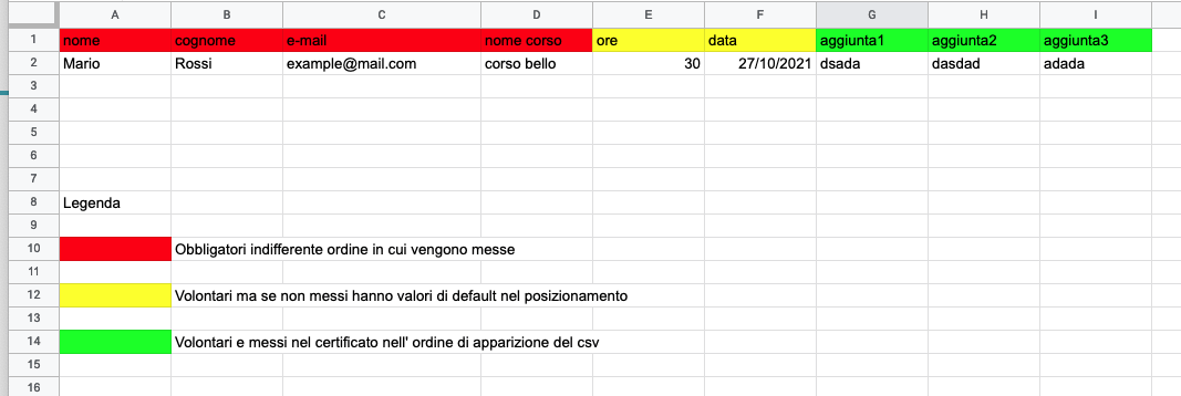 Ecco uno screenshot di un csv modello.